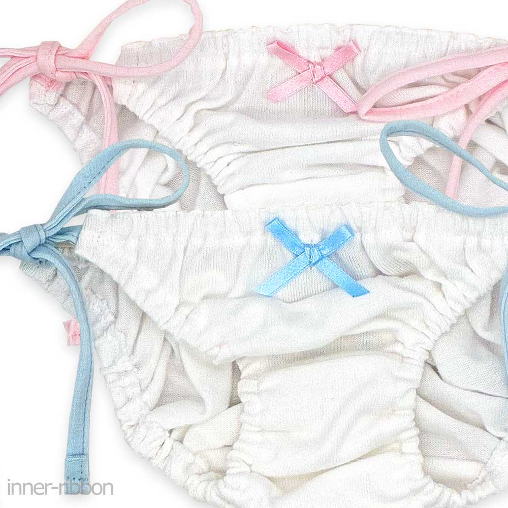 ひもをほどく瞬間がたまらないセクシーで可愛いロリパン♪通気性が良く肌に優しいコットン100%のパンティです。インゴムタイプで直接肌に当たらない肌にやさしい仕様です。見た目はクシュっとしていますが、着用すると凄く伸びます。