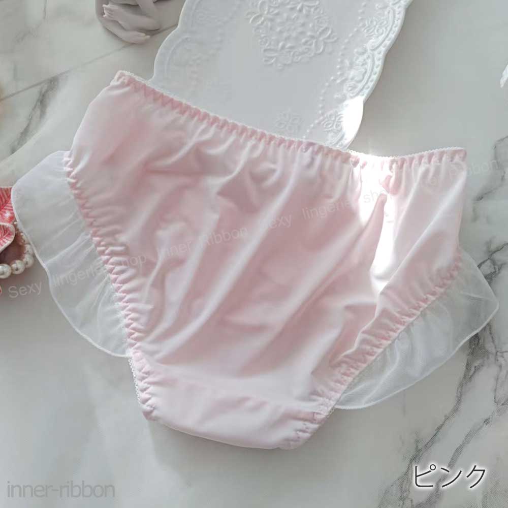 女性らしさを引き立てるデザインが魅力です。フロントからバックへのフリルが優雅さを演出し、リボンが可愛らしさを添えています。フルバックスタイルで、しっかりとヒップを包み込みます。Mから3Lまでのサイズ展開で、幅広い体型に対応。学生から大人の女性まで、日常使いにぴったりの一枚です。